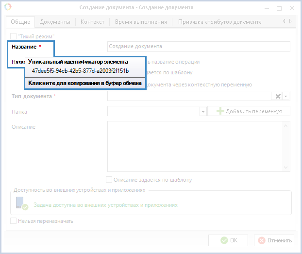 Каждый элемент имеет уникальный идентификатор элемента (UID). Для того, чтобы узнать данный номер необходимо открыть окно настроек элементов и на вкладке Общие навести указатель мыши на наименование поля Название. При этом будет отображен UID элемента (рис. 2). Для того, чтобы скопировать данный UID в буфер обмена необходимо нажать левой кнопкой мыши по наименованию поля Название один раз. UID будет скопирован в буфер обмена.