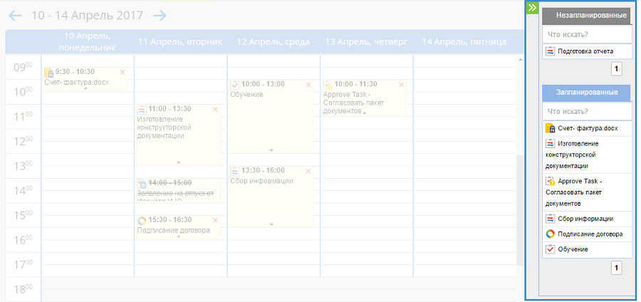 Поле с рабочим временем (в соответствии с производственным календарем) на предприятии отмечено белым цветом, нерабочие часы – серым, текущий день – темно-желтым. События в календаре могут быть запланированы как на рабочее время, так и на сверхурочное.