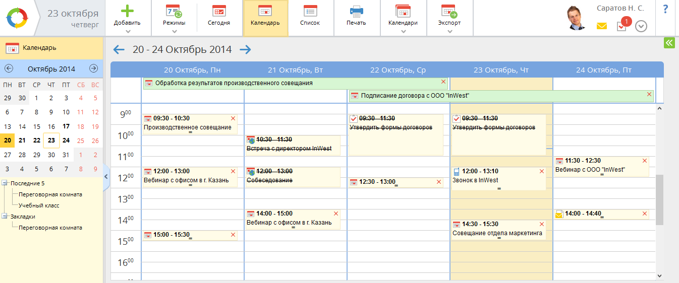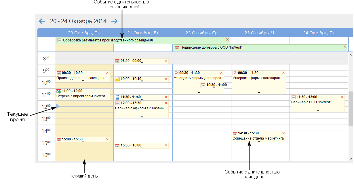 Мой календарь – возврат к просмотру своего календаря (полезно в том случае, если пользователь в данный момент просматривает общий календарь или календарь другого пользователя).