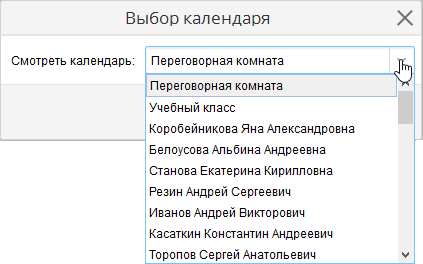 Для просмотра календаря другого пользователя необходимо в разделе Календари нажать кнопкой мыши на кнопку Календари, во всплывающем окне (рис. 1) выбрать необходимый календарь и нажать на кнопку Смотреть. На странице отобразится выбранный календарь (рис. 2).