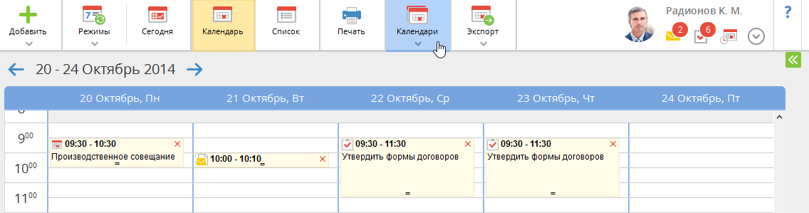 Для просмотра общего календаря в разделе Календарь в верхнем меню системы нажмите на кнопку Календари (рис. 1).