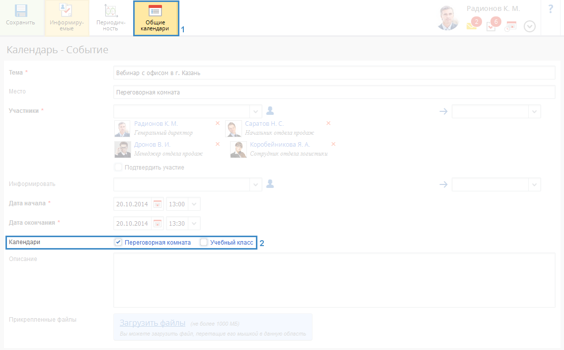 Отличие заключается лишь в том, что у сотрудников, имеющих соответствующие права на создание событий в общем календаре, на странице создания события в верхнем меню отображается кнопка Общие календари (рис. 4, пункт 1).