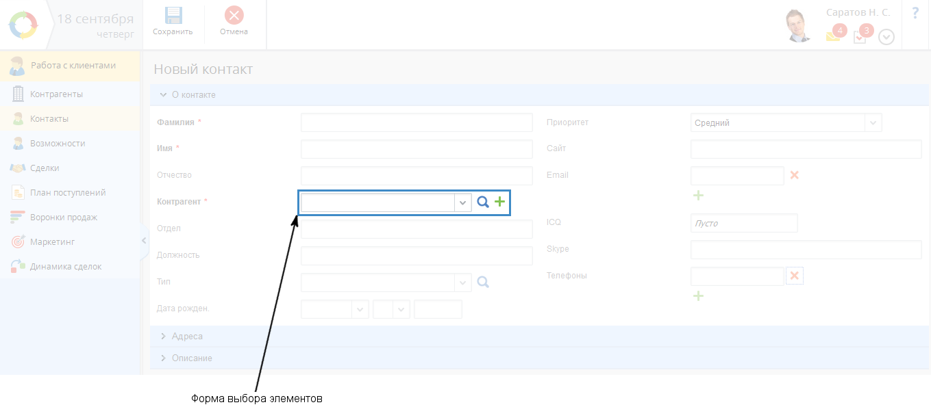 Если соответствующий справочник содержит много объектов, то в выпадающем списке отобразятся только 100 из них. В случае, если этого количества элементов недостаточно, следует использовать быстрый поиск в этом же поле.
