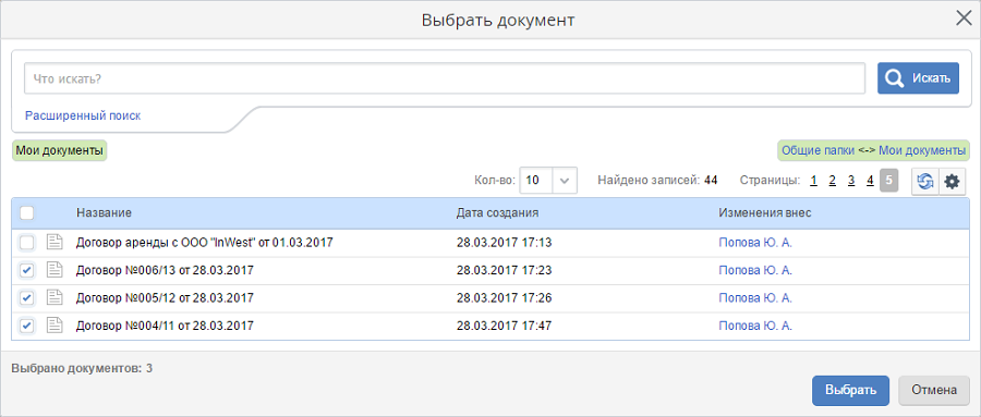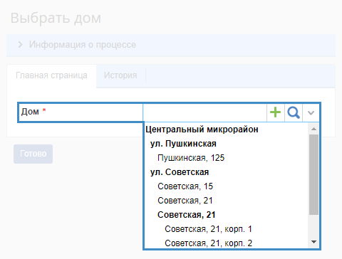 1. В поле ввода на форме выбора элементов ввести часть названия искомого элемента. Данная функция активна, если в настройках свойства-наименования объекта включен быстрый поиск. В выпадающем списке отобразятся элементы, в названии которых содержатся введенные символы. Необходимо выбрать нужный элемент из выпадающего списка.