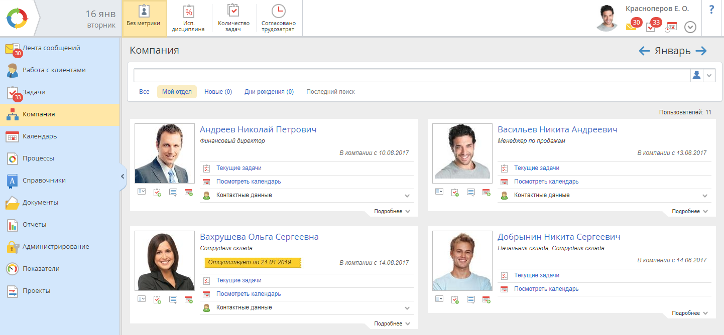 Мой отдел – отображение только подчиненных сотрудников текущего пользователя (согласно оргструктуре предприятия);