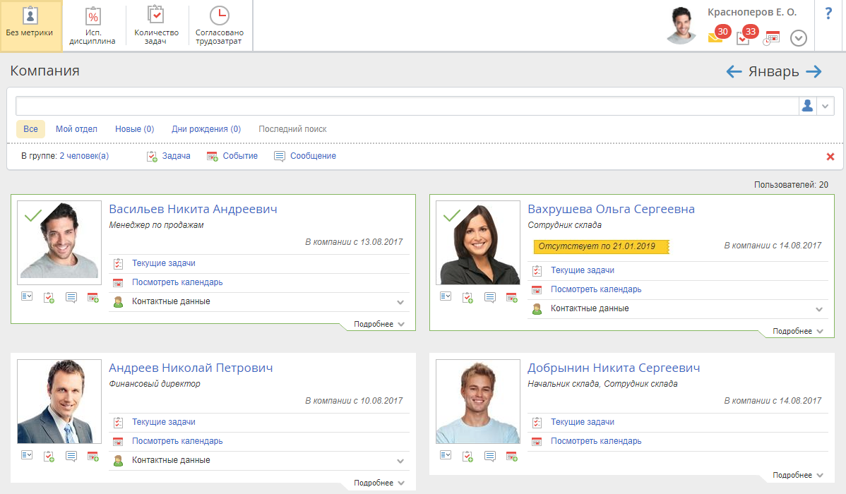 Данный раздел предназначен для просмотра сводной информации обо всех пользователях системы ELMA, а также для быстрого доступа к выполнению некоторых действий (создание задачи, отправка сообщения, создание события и др.).