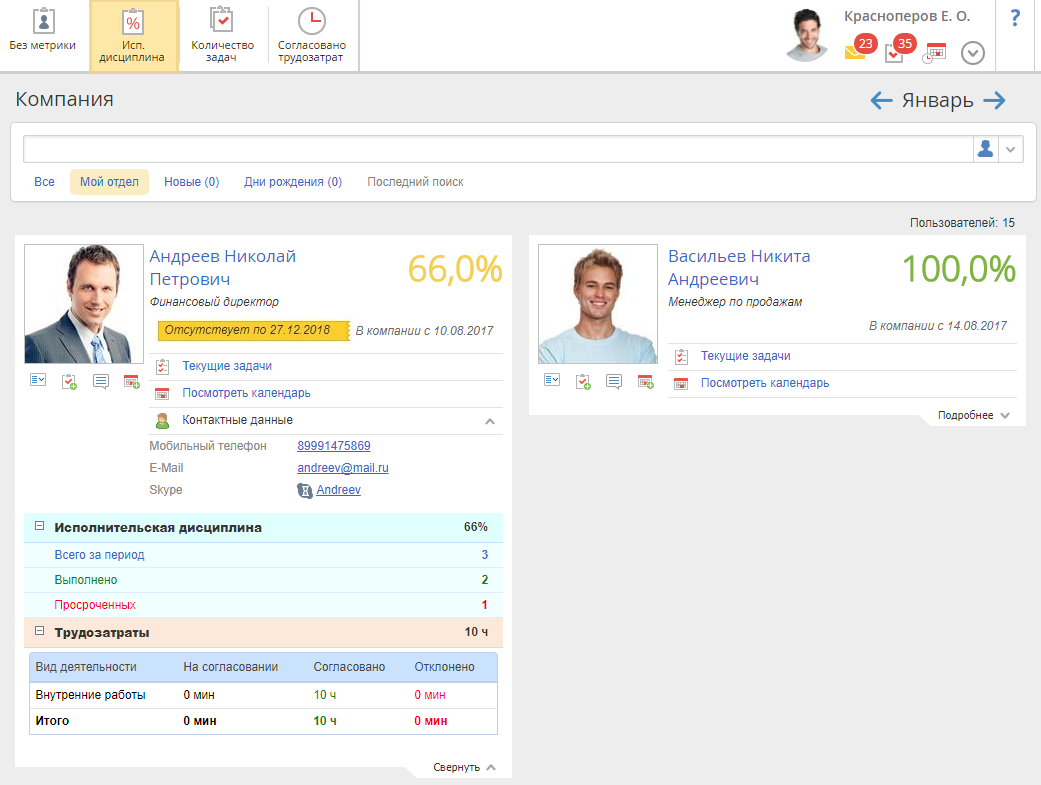 8. блоки Исполнительская дисциплина и Трудозатраты. Данные блоки отображаются только для пользователей, которые являются подчиненными текущего пользователя (согласно оргструктуре предприятия).