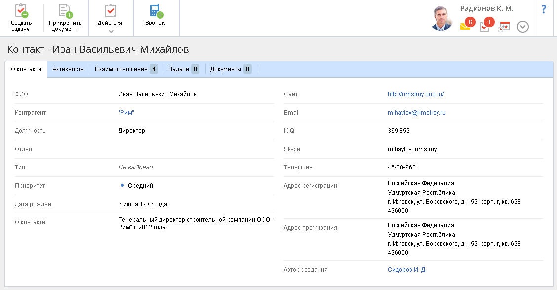 Рис. 1. Карточка контакта. Вкладка "О контакте"