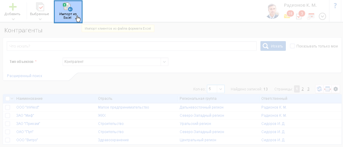 Для сохранения внесенных изменений необходимо нажать на кнопку Сохранить. Контрагенты, контакты и/или возможности будут импортированы из файла Excel в соответствующие разделы системы ELMA. После сохранения внесенных изменений будет осуществлен автоматический переход на страницу Контрагенты.