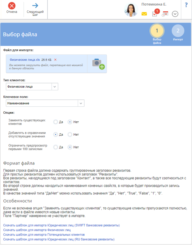На данной странице будет отсутствовать раздел Клиенты (Юридическое/Физическое лицо/Возможность), а также возможность сохранения импортированных данных.