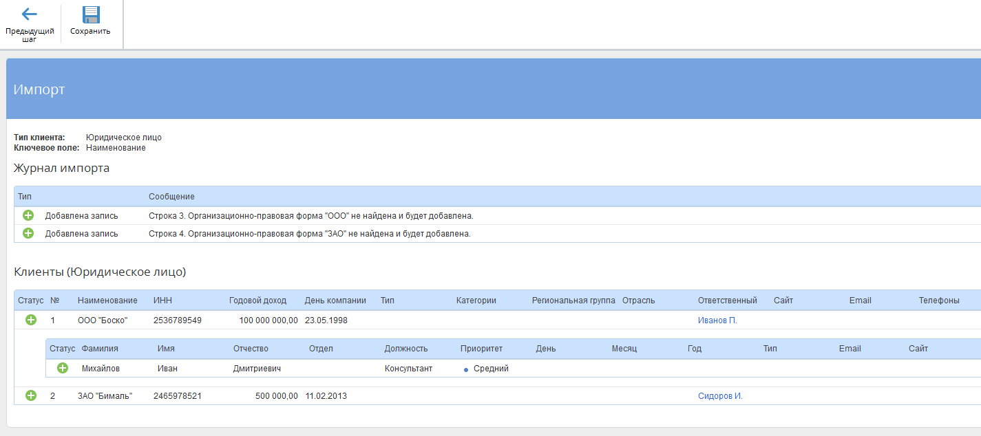 В разделе Клиенты (Юридическое/Физическое лицо/Возможность) отображены результаты импорта, которые будут добавлены в соответствующие разделы системы ELMA.