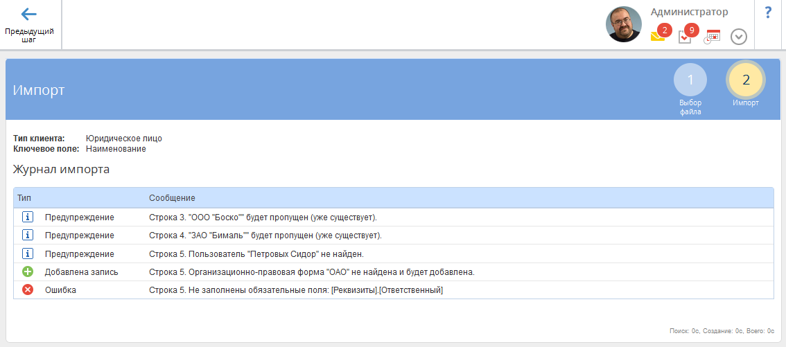 В том случае, если шаблон файла для импорта был заполнен некорректно или в нем были не заполнены обязательные поля, то будет отображена страница Импорт (рис. 5) с соответствующим сообщением в разделе Журнал импорта.