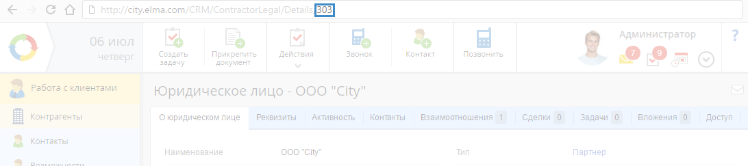 Рис.1. Карточка контрагента. Id контрагента в строке браузера