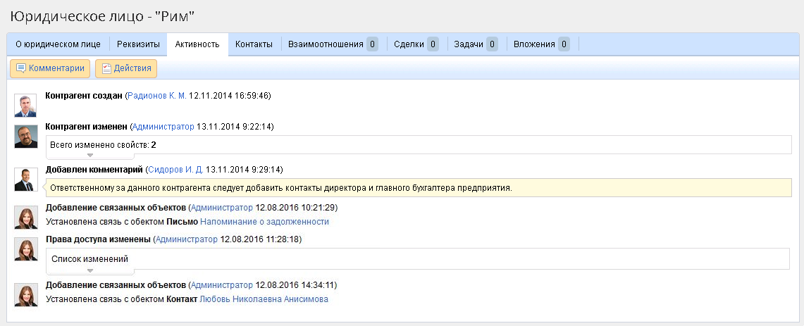 На данной вкладке отображается панель истории работы с карточкой контрагента со всеми активностями в ней (комментариями и историей действий – изменение и удаление контрагента, изменение адреса контрагента, создание подчиненных объектов, изменение списка категорий, изменение прав категорий, изменения прав доступа).