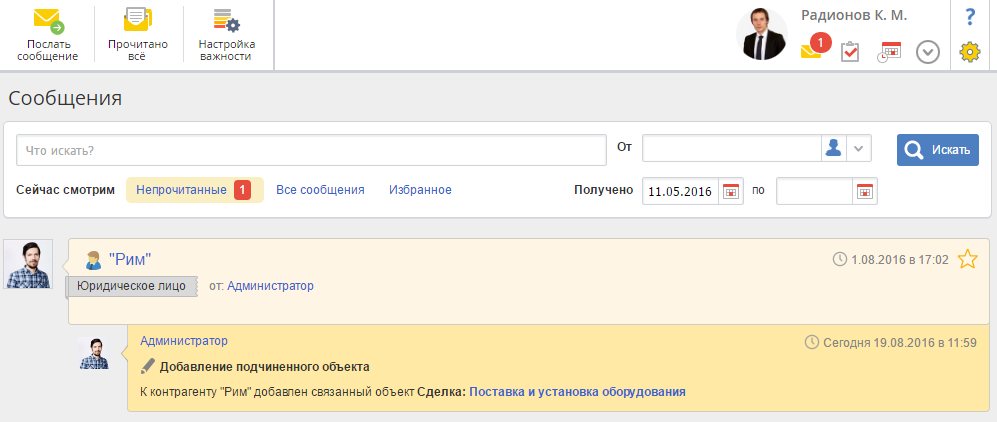 Если пользователь подписан на оповещения и в карточку контрагента вносятся следующие изменения: создание, изменение или удаление подчиненного объекта, изменение списка категорий, изменение прав категорий, то в ленту сообщений пользователя будут приходить сообщения о перечисленных изменениях (рис. 6).