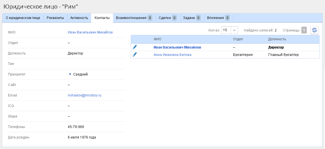 Пример вкладки Контакты карточки юридического лица представлен на рис. 7.