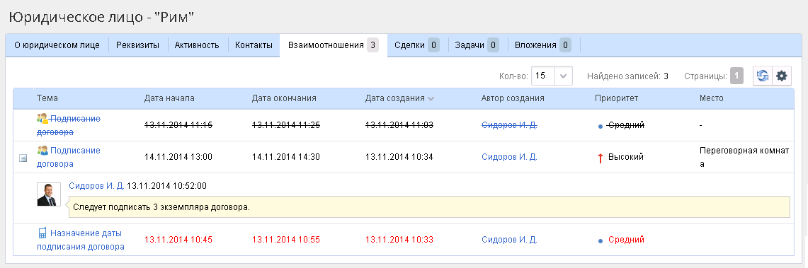 При наличии у взаимоотношения комментариев, все они будут отображены в таблице под строкой с данным взаимоотношением. Подробнее о комментариях в взаимоотношениям см. соответствующий раздел справки.