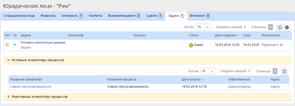 Рис. 10. Вкладка "Задачи" карточки юридического лица
