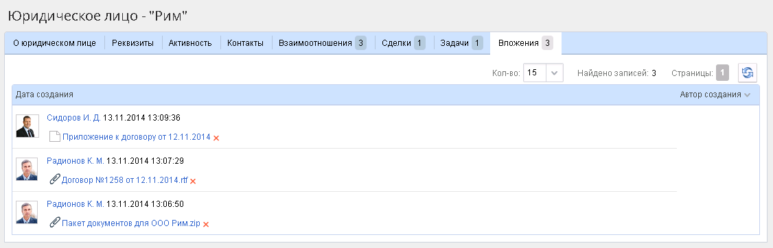 Рис. 11. Вкладка "Вложения" карточки юридического лица