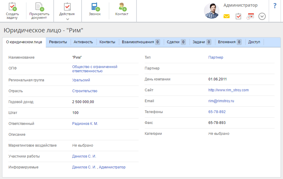 На рис. 2 приведен пример карточки контрагента (юридическое лицо).