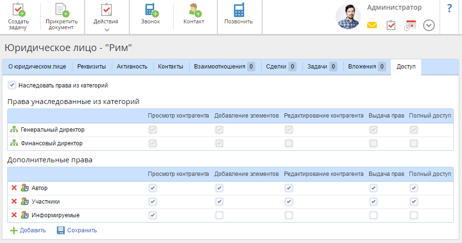 Наследовать права из категорий – возможность наследования прав доступа, указанных в категории, к которой относится данный контрагент.