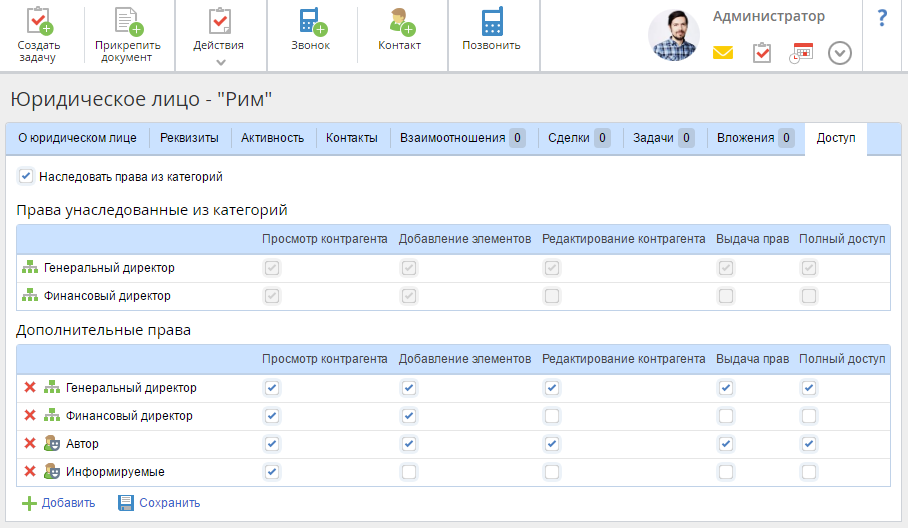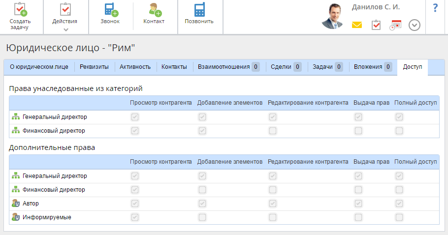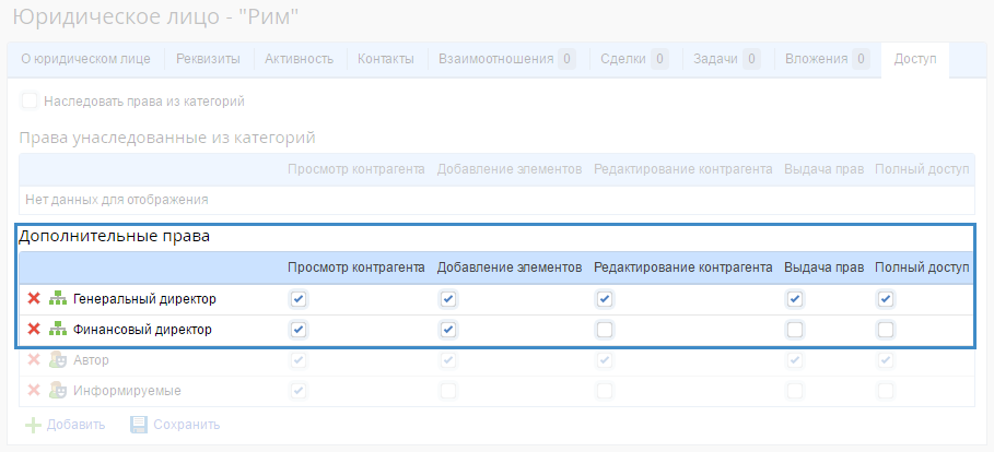 После этого уровни прав доступа, указанные в категории данного контрагента, будут отображаться в блоке Дополнительные права (рис. 15). Стоит отметить, что данные уровни прав доступа станут доступны для редактирования.