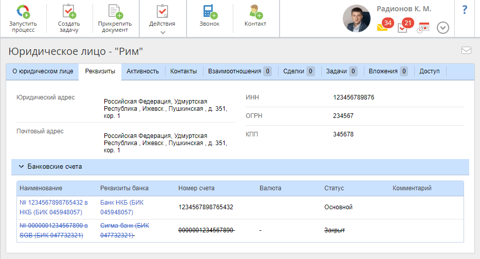 Рис. 3. Вкладка "Реквизиты" карточки юридического лица