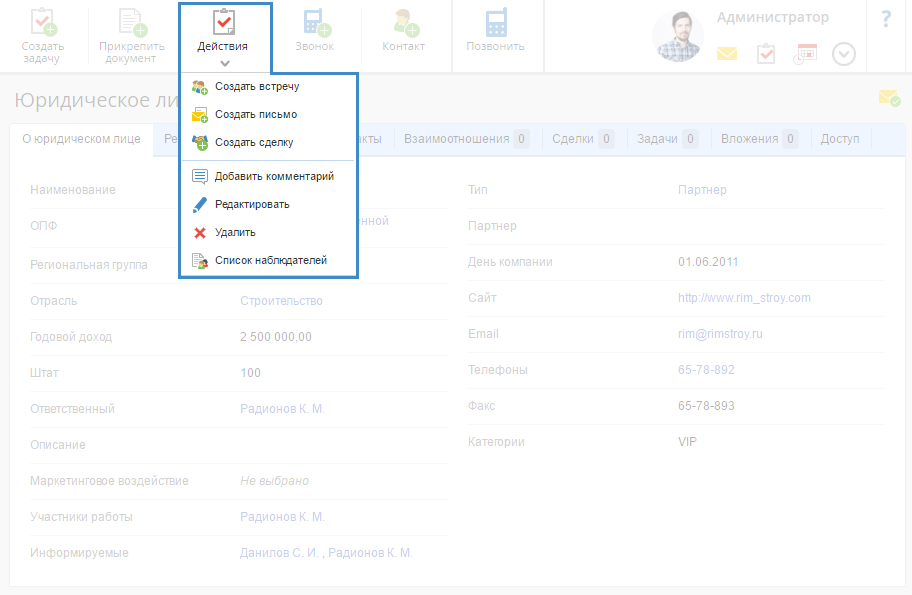 Чтобы создать подписку не только для текущего, но и для любого пользователя системы, необходимо в верхнем меню карточки контрагента нажать на кнопку Действия – Список наблюдателей (рис. 1).