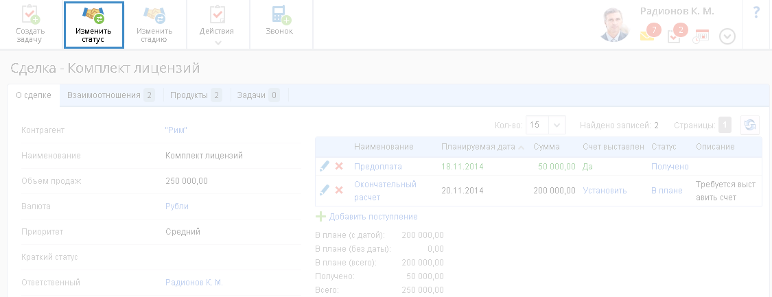 Статус – это текущее состояние сделки. Статус сделки может быть изменен на любой ее стадии.
