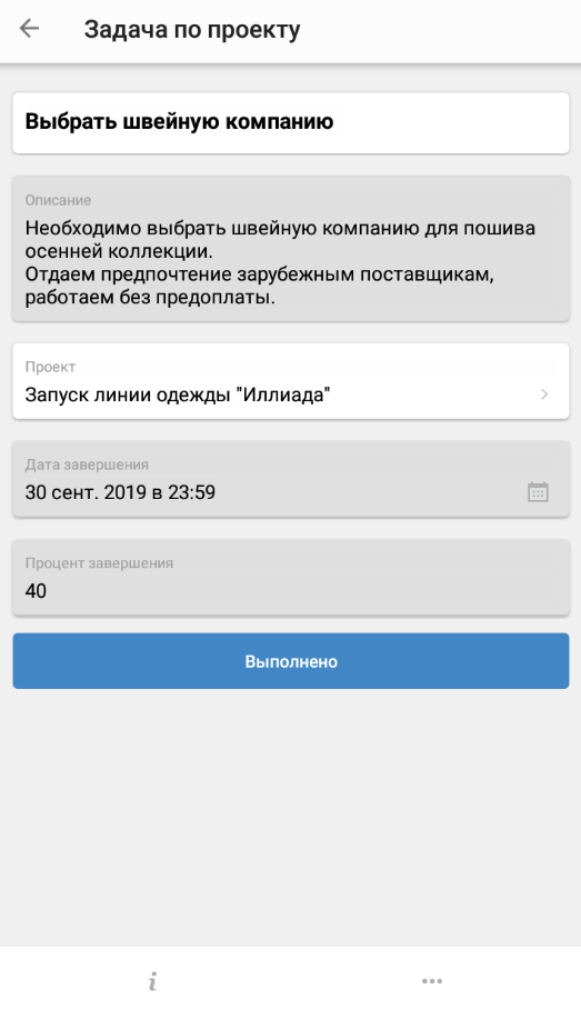Рис. 1. Мобильное приложение "ELMA Mobile". Страница задачи по проекту