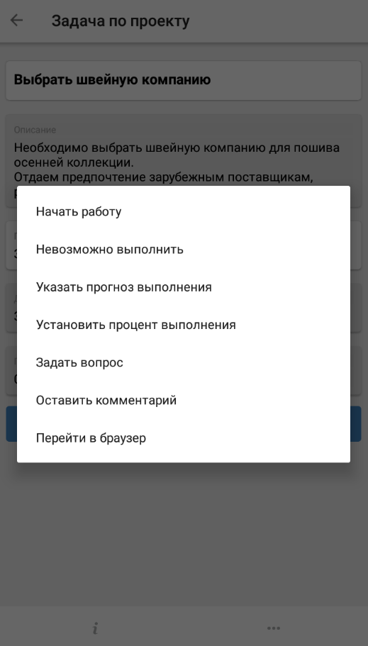 Рис. 2. Мобильное приложение "ELMA Mobile". Страница задачи по проекту. Действия