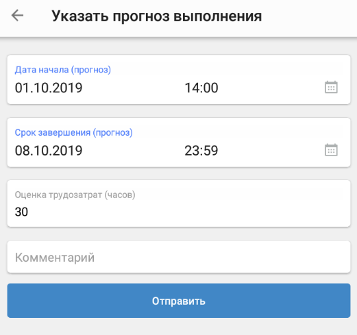 Рис. 3. Мобильное приложение "ELMA Mobile". Страница задачи по проекту. Указание прогноза выполнения