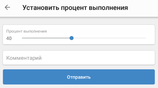 Установить процент выполнения – указание процента выполнения задачи. При нажатии на данный пункт меню будет открыта страница, на которой можно установить или изменить процент выполнения (рис. 4). Работа с процентом выполнения осуществляется с помощью перемещения ползунка вправо/влево. Кроме того, доступна возможность добавления комментария. Для сохранения процента требуется нажать на кнопку