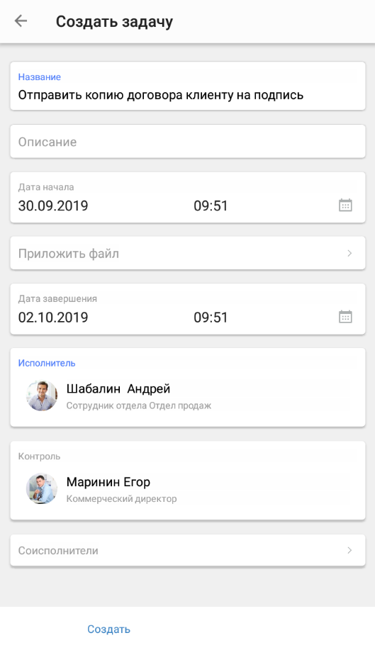 Рис. 2. Мобильное приложение "ELMA Mobile". Форма создания задачи