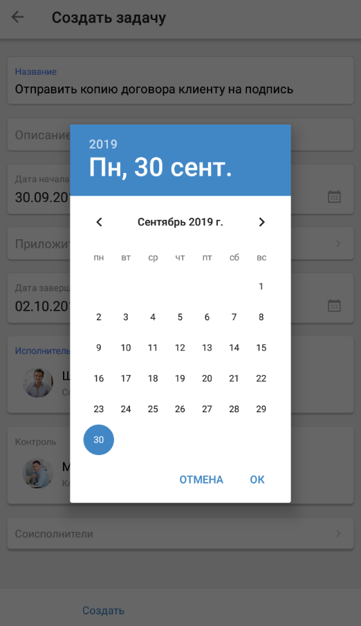 Рис. 3. Мобильное приложение "ELMA Mobile". Платформа Android. Форма создания задачи. Выбор даты
