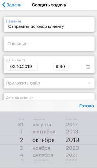 Рис. 4. Мобильное приложение "ELMA Mobile". Платформа iOS. Форма создания задачи. Выбор даты начала