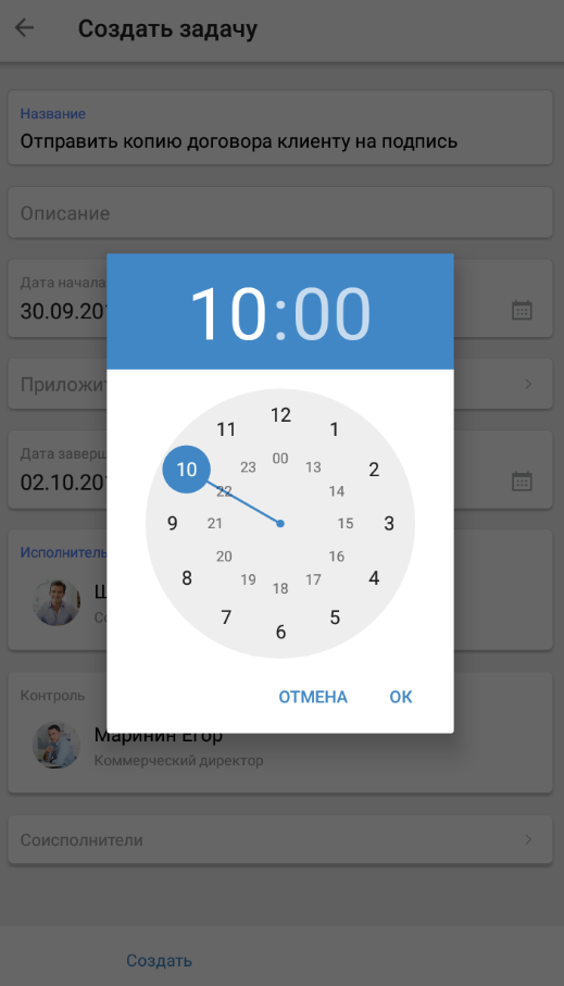 Рис. 5. Мобильное приложение "ELMA Mobile". Форма создания задачи. Выбор времени