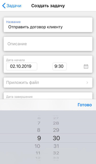 Рис. 6. Мобильное приложение "ELMA Mobile". Платформа iOS. Форма создания задачи. Выбор времени