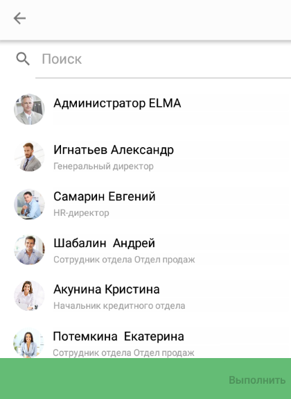 Рис. 7. Мобильное приложение "ELMA Mobile". Форма создания задачи. Выбор исполнителя
