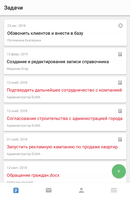 Рис. 1. Мобильное приложение ELMA Mobile. Раздел "Задачи"