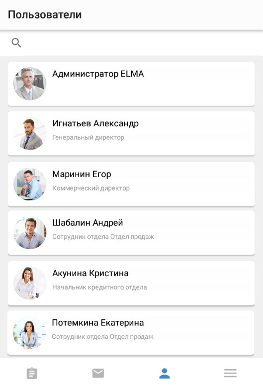 Рис. 1. Мобильное приложение "ELMA Mobile". Раздел "Пользователи"