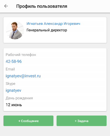 Контакты пользователя доступна возможность перейти к соответствующему действию – позвонить, отправить письмо на Email или сообщение в Skype.