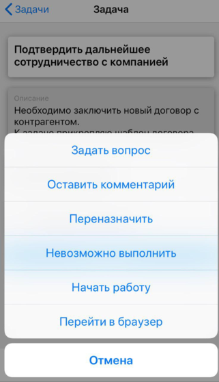 Рис. 8. Мобильное приложение "ELMA Mobile". Платформа iOS. Действия с задачей