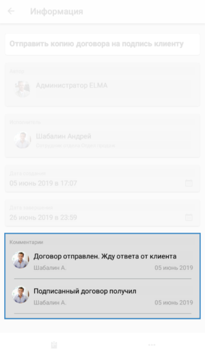Рис. 10. Мобильное приложение "ELMA Mobile". Информация о задаче. Комментарии