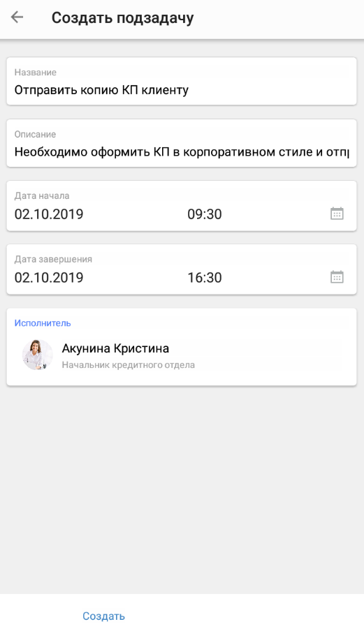 Рис. 11. Мобильное приложение "ELMA Mobile". Страница создания подзадачи