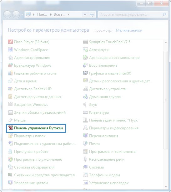 После установки плагина "Рутокен" и драйвера "Рутокен" на панели управления компьютером появляется пункт "Панель управления Рутокен" (рис. 1).