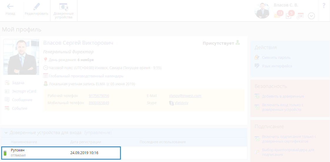 Токен привяжется к учетной записи пользователя и будет соответствовать исключительно той учетной записи, к которой он привязан. В профиле пользователя в разделе Доверенные устройства отобразится привязанный к учетной записи токен (рис. 9).
