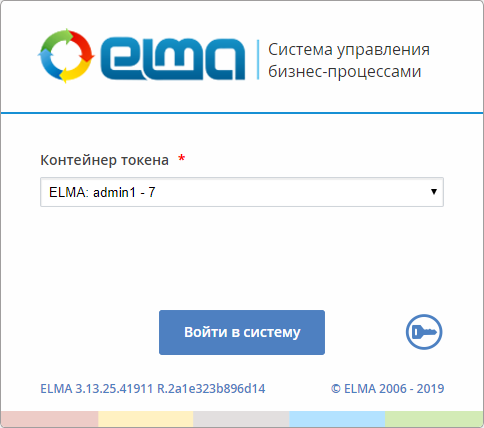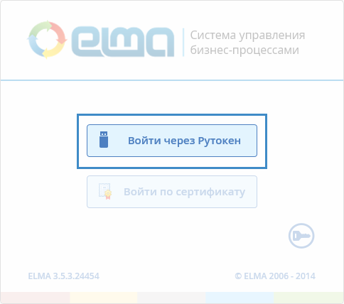 Для того чтобы войти в систему ELMA с помощью токена, необходимо подключить токен к компьютеру и в строке браузера ввести адрес или имя сервера ELMA и порт для подключения к веб-серверу ELMA. В окне авторизации в системе в правом нижнем углу нажмите