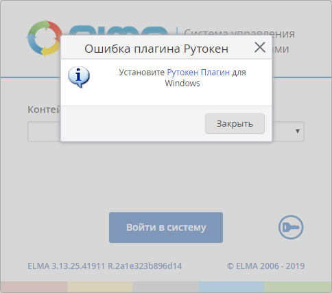 При отсутствии установленного плагина Рутокен отображается ошибка с указанием ссылки на загрузку файла Рутокен Плагин для Windows (Рис. 15).