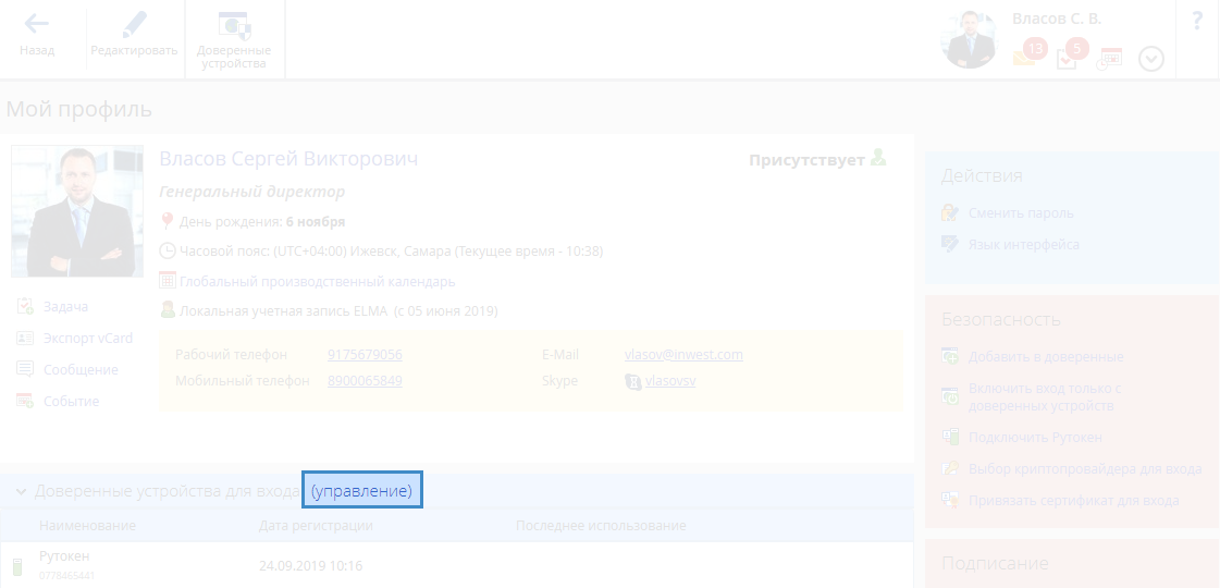 Рис. 9. Профиль пользователя. Раздел "Доверенные устройства"